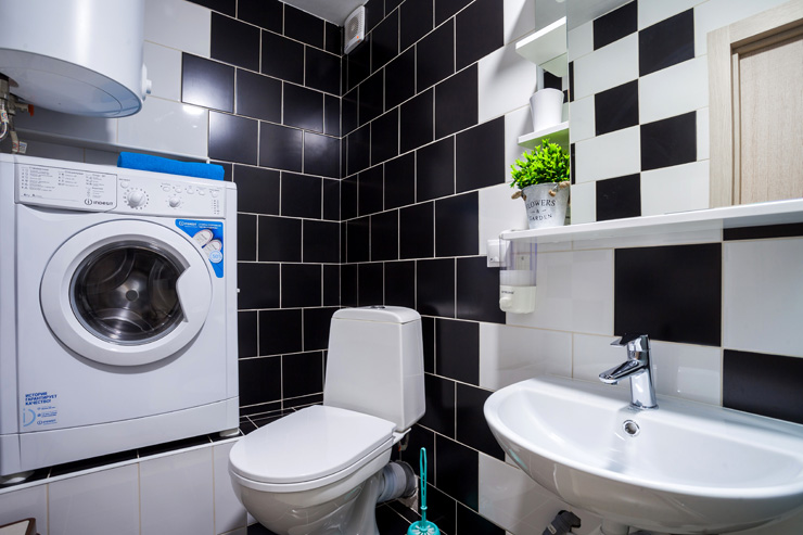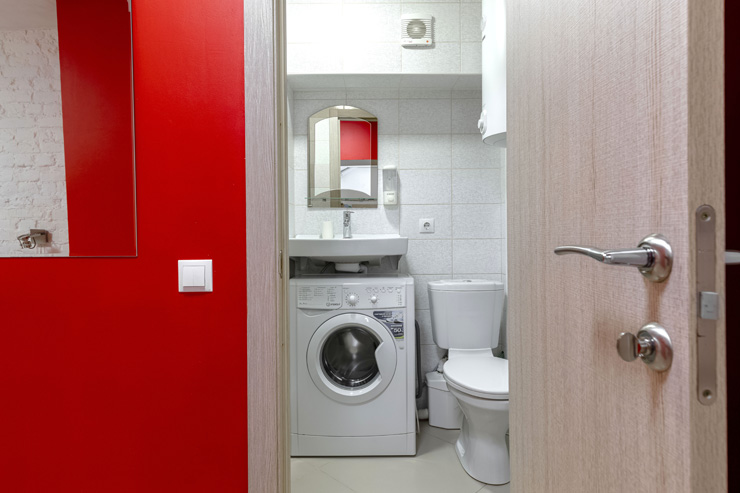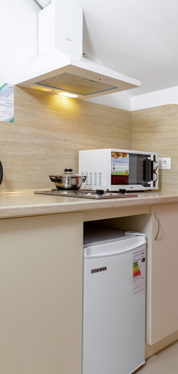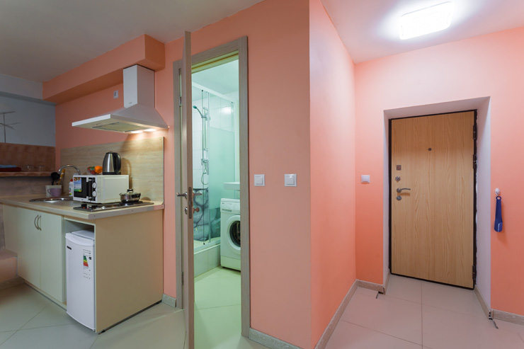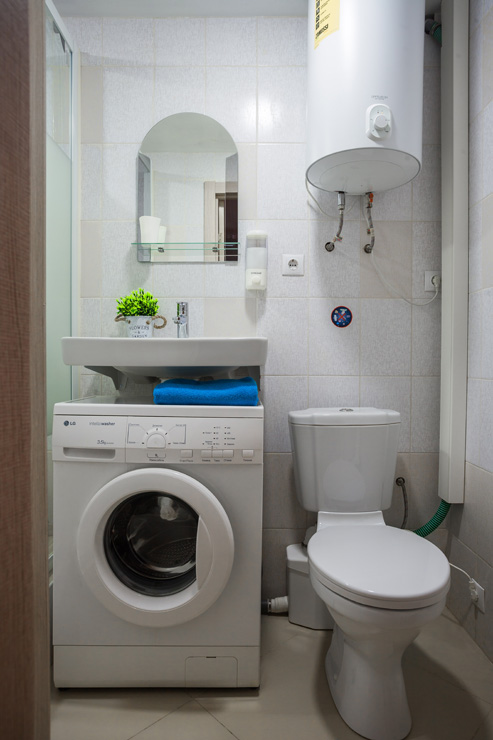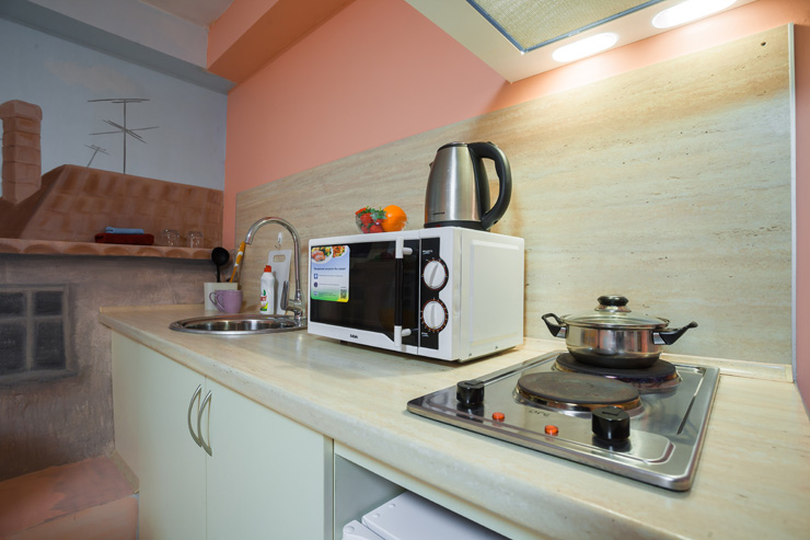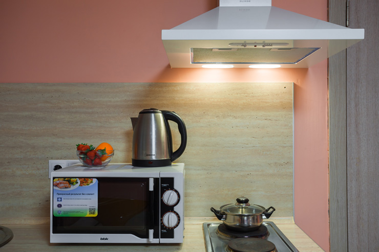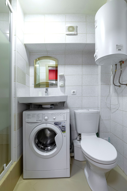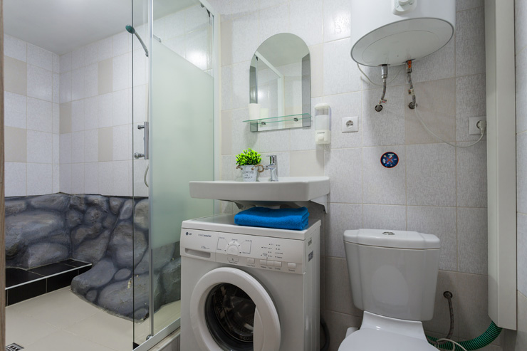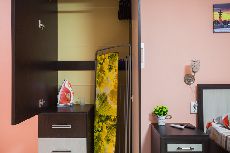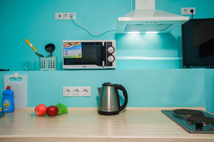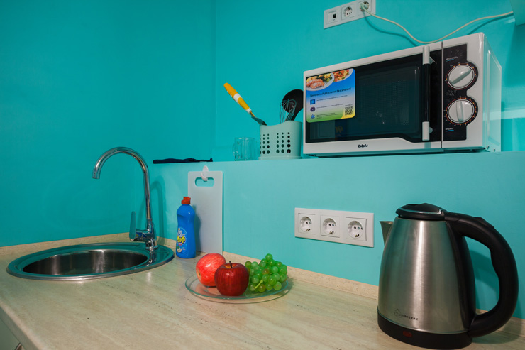 - Оборудование: гладильная доска, микроволновая печь, мини-холодильник, набор посуды, плита электрическая, стиральная машина, телевизор, утюг, электрочайник