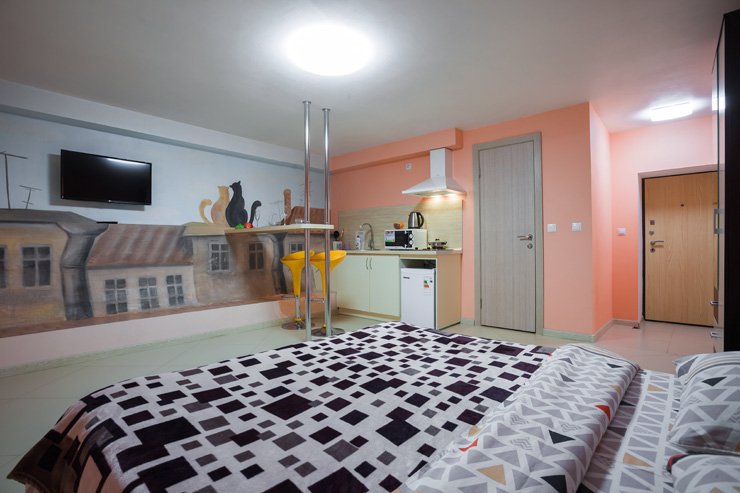 | Студия 2-местная №4 | 22 кв.м. | 2 чел. | Кухня, Мебель (зеркало, кровать двуспальная, прикроватные тумбочки, стол, столик журнальный, стулья,... |